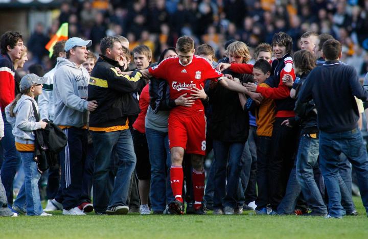 在赛季末对阵赫尔城的比赛中,杰拉德被支持者包围。2012年5月9日。摄影师:Craig Brough