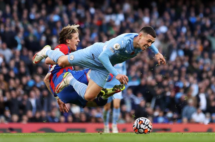 水晶宫的康纳·加拉格尔在阿提哈德球场与曼城的菲尔·福登相撞。2021年10月30日。摄影师:Naomi Baker