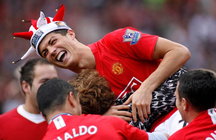 曼联的克里斯蒂亚诺·罗纳尔多在赢得英超联赛冠军后与自己的家人庆祝。2009年5月16日。摄影师:Ed Sykes