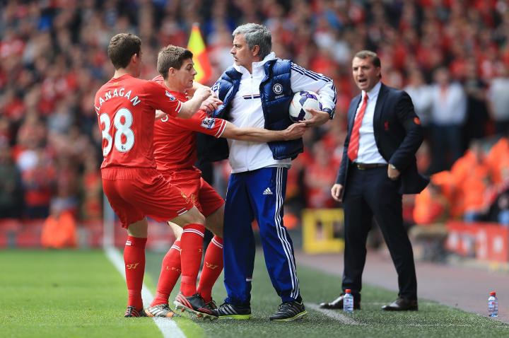 利物浦的杰拉德试图从切尔西主教练穆里尼奥手中夺回球。2014年4月27日。摄影师:Simon Stacpoole