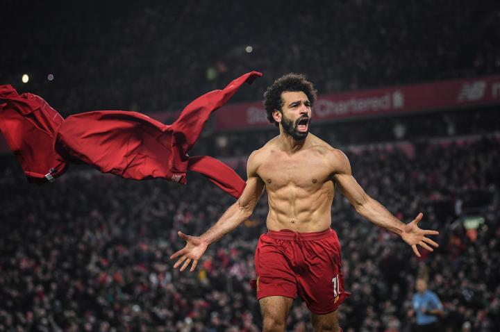 利物浦的萨拉赫在安菲尔德的KOP看台前庆祝对阵曼联的进球。2020年1月19日。摄影师:Michael Regan