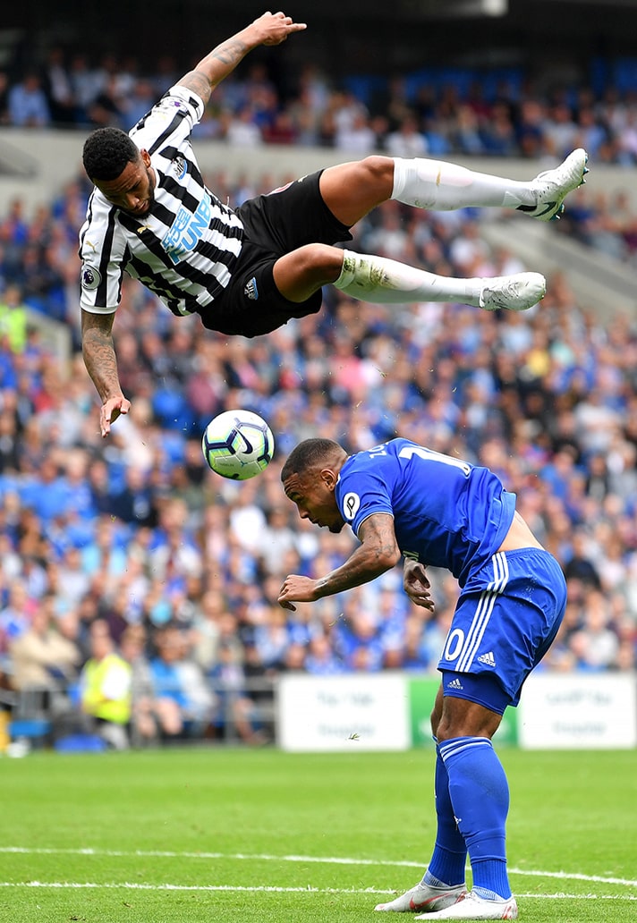 纽卡斯尔的贾马尔·拉塞尔斯(Jamaal Lascelles)与卡迪夫城的肯尼斯·佐霍尔在空中争夺球权。2018年8月18日。摄影师:Dan Mullan