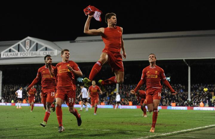 杰拉德在对阵富勒姆的比赛中庆祝得分,他在出征到克拉文农场球场的利物浦球迷面前脱掉了他的球衣。2014年2月12日。摄影师:Kevin Quigley