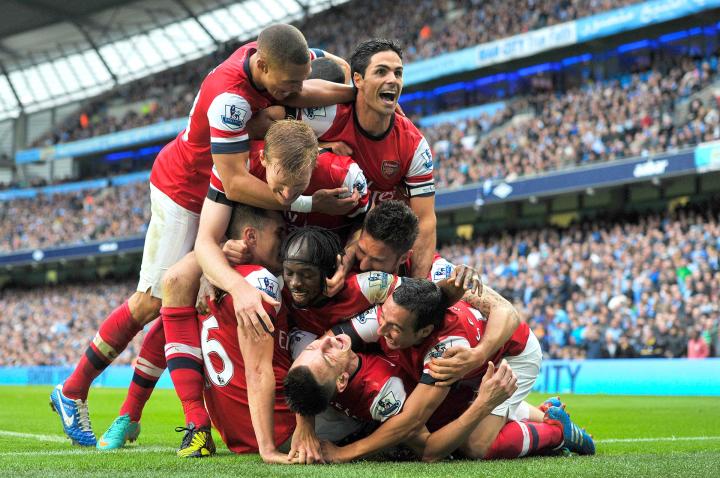 阿森纳的科斯切尔尼(下)在庆祝对阵曼城的进球时被队友团团压住。2012年9月23日。摄影师:Martin Rickett
