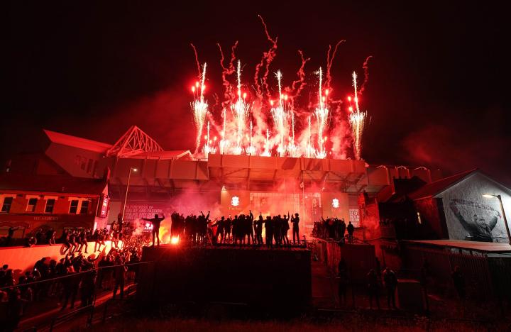 利物浦球迷在安菲尔德球场外疯狂庆祝,球队刚刚获得了他们的第一个英超联赛冠军奖杯,但由于新冠疫情,球迷没法进入球场与球队一起庆祝,但也有别一番风景。2020年7月22日。摄影师:Jon Super