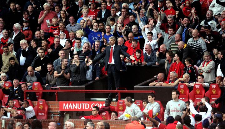 阿森纳主帅温格在老特拉福德被迈克·迪恩罚下。 温格在已经满员的董事包厢中找不到座位,因此站在隧道的屋顶上,这让加里·内维尔(左下)和曼联球迷都十分惊讶。2009年8月29日。摄影师:Carl Recine