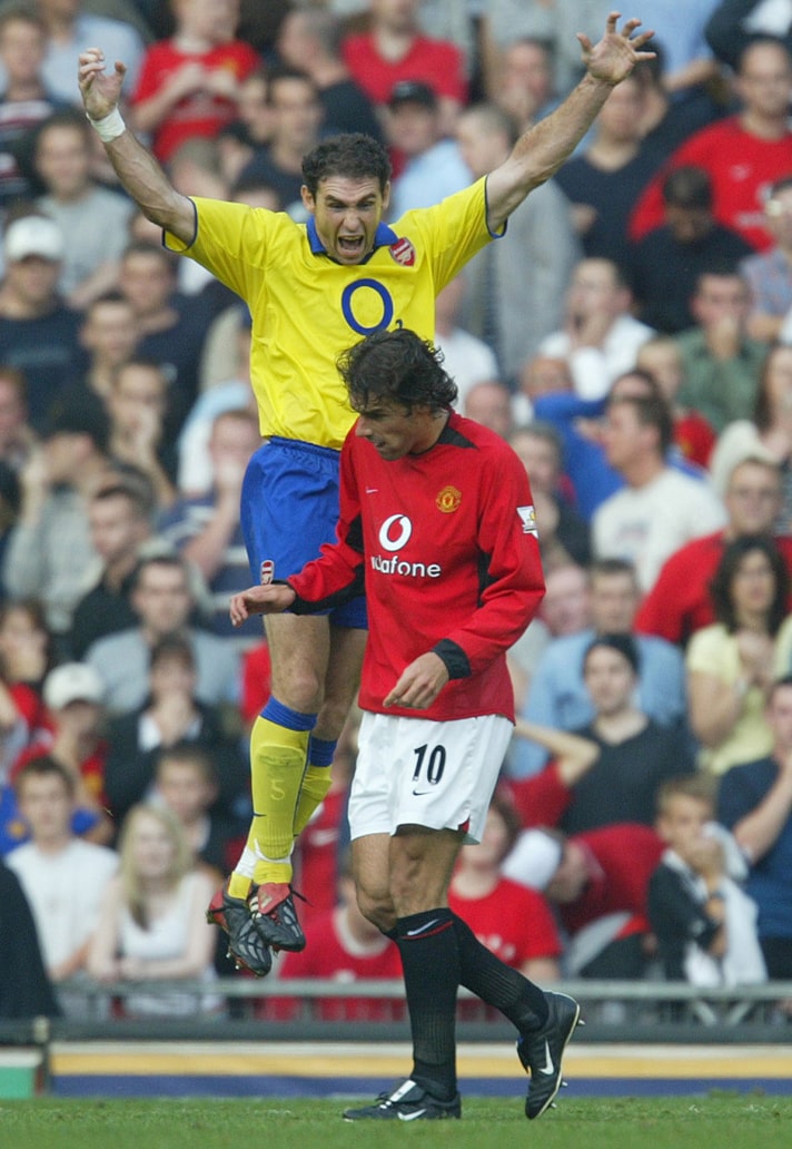 在比赛最后一分钟范尼罚失点球后,阿森纳名宿马丁·基翁疯狂庆(chao)祝(feng)。2003年9月21日。摄影师:Mark Robinson
