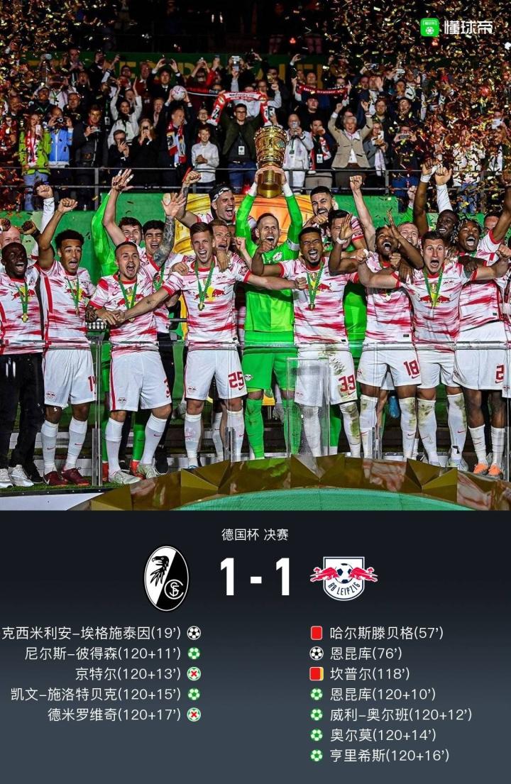 点球大战中,京特尔、德米罗维奇罚失;莱比锡弹无虚发。最终,十人莱比锡点球大战4-2,总比分5-3击败弗赖堡,队史首夺德国杯冠军!
