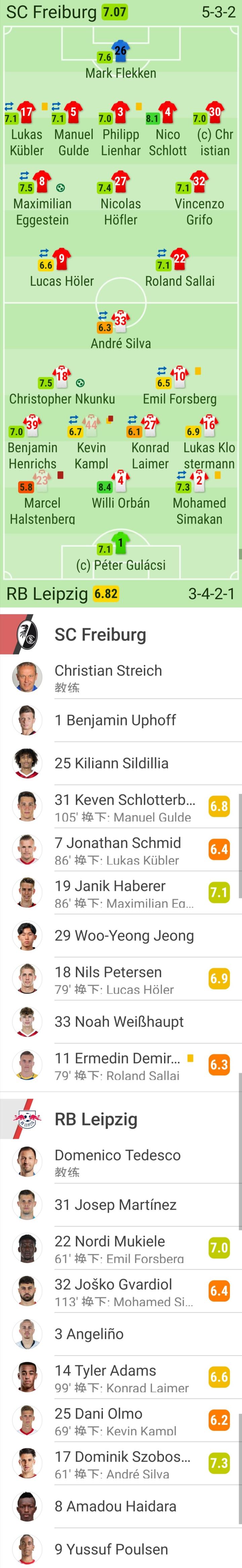 RB莱比锡首发:1-古拉西奇、23-哈尔斯滕贝格、4-威利-奥尔班、2-西马坎(112'32-格瓦迪奥尔)、16-克洛斯特曼、27-莱默尔(98'14-泰勒-亚当斯)、44-坎普尔(68'25-奥尔莫)、39-亨里希斯、18-恩昆库、10-福斯贝里(60'22-穆杰莱)、33-安德烈-席尔瓦(60'17-索博斯洛伊)