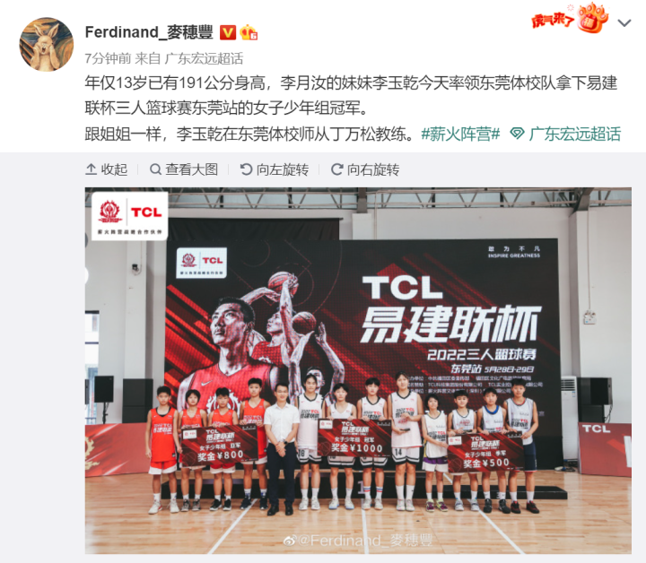 现如今,李月汝已经是WNBA球员,是国家队的主力中锋,她的妹妹李玉乾也到了东莞体校,成了丁万松的弟子。最近两天,李玉乾代表东莞体校出战今年的易建联杯三人篮球赛。据国内篮球记者麦穗丰透露,李玉乾于昨天下午在东莞站的比赛里带队夺冠。