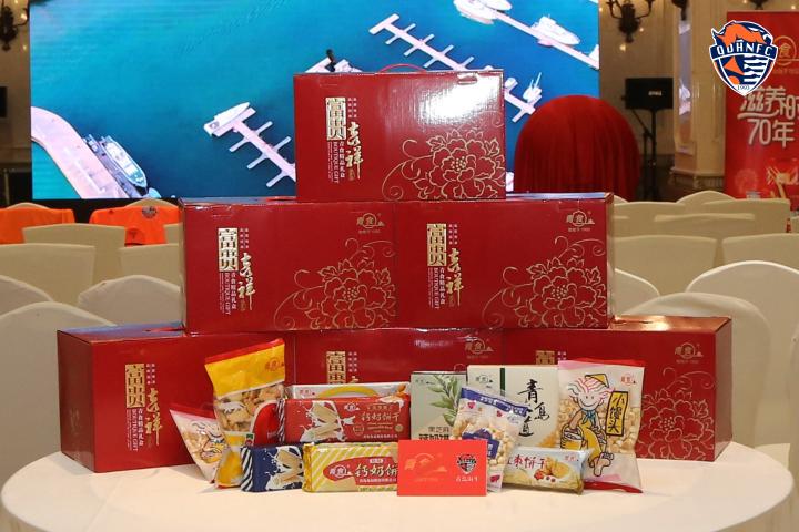(海牛俱乐部副董事长兼总经理张冬与青岛食品党委书记、董事长仲明互赠礼物)