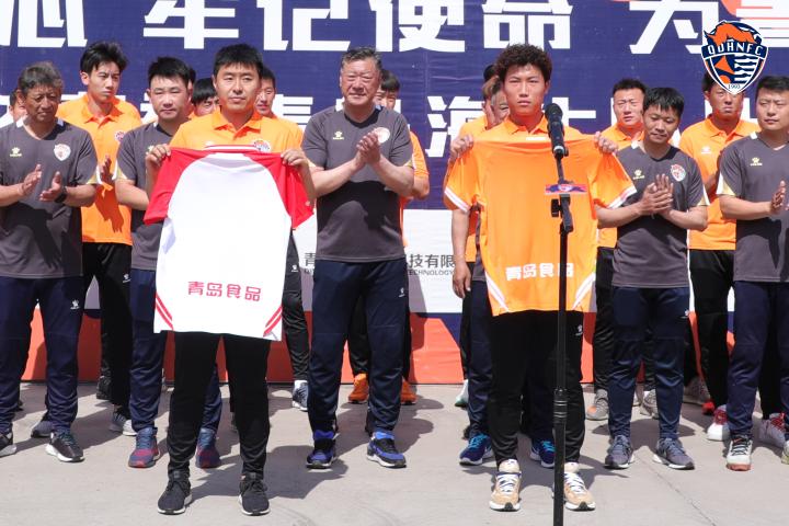 (出征仪式上姜宁、谢文能展示印有”青岛食品“字样的球衣)