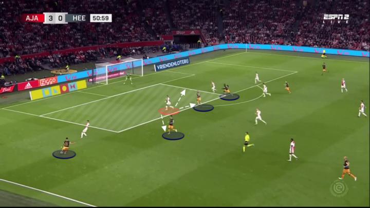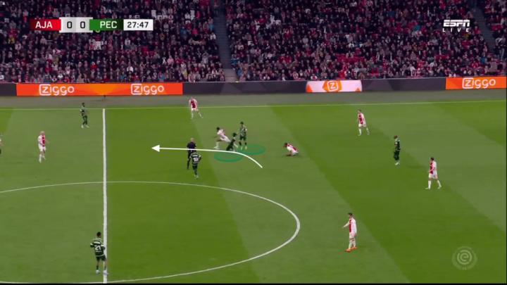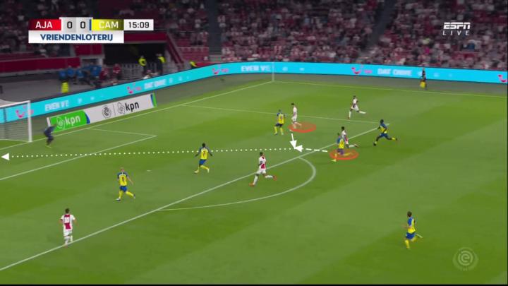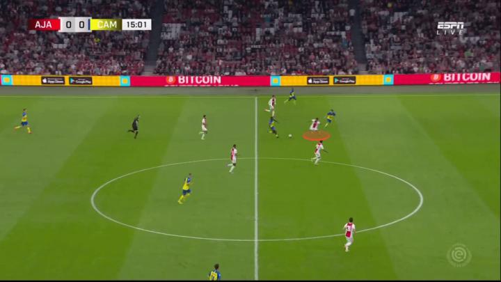 对阵坎布尔一战的首粒进球不仅证明了廷贝尔的转换防守能力,也证明了他的整体天赋。咱们从坎布尔持球时说起,阿贾克斯尝试逼抢,客队漂亮地实现破解。对方前锋带球突进,廷贝尔适当回撤,看到对方触球力度过大后,他此时的位置正好能出脚抢断。