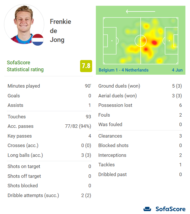 德容本场比赛2次过人全部成功,防守端则有1次抢断,2次拦截和3次解围。93次触球,82次传球,包含4次关键传球,传球成功率94%。