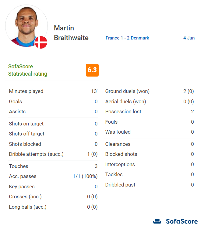 3.布莱斯维特:法国1-2丹麦,第84分钟替补出场。