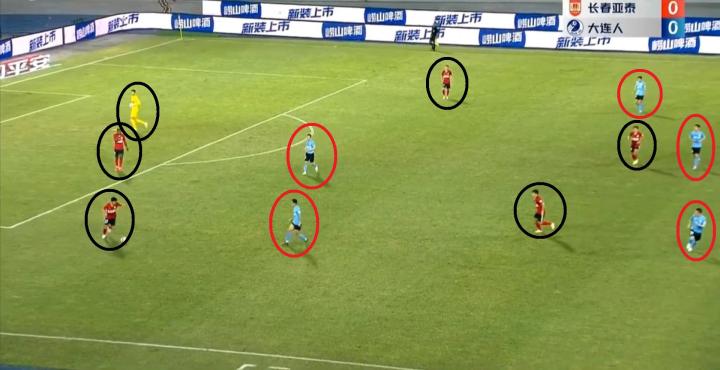 在大连人开始逼抢的时候,双方投入的兵力是5对6: