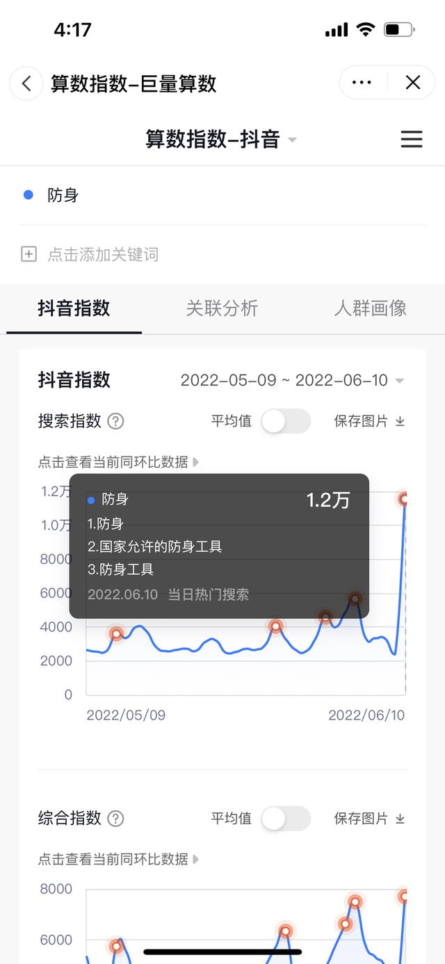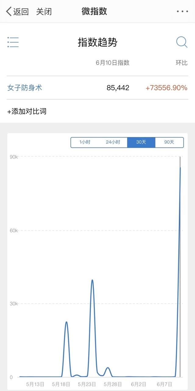新浪微博“微指数”趋势显示,过去30天内关键词“防身术”的热度,在6月10日到达极值,日指数达到815301次,环比增加123805.93%;当天,关键词“防身”的微信指数热度日环比上升了235.26%。