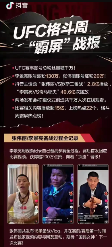 同时,UFC在中国也有很大的受众群,在全国范围内覆盖用户已接近6亿个家庭,有着超高的人气。在2021年的UFC格斗周中,根据抖音公布的UFC格斗周“霸屏”战报,UFC赛事账号总粉丝量破千万!李景亮账号涨粉130万,张伟丽账号涨粉20万!比赛相关内容播放超15亿,上榜热点22个,格斗周霸屏热点榜!
