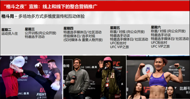 根据UFC亚太区市场推广负责人的介绍,2020年UFC上海“格斗之夜”的宣推采取了线上和线下的整合营销推广形式,格斗周使用多场地多方式多维度宣传和互动体验。“格斗之夜”的直播采取了电视,新媒体和UFC Fight Pass全球播出,格斗之夜的赛事直播和播出平台覆盖亚洲和全球。