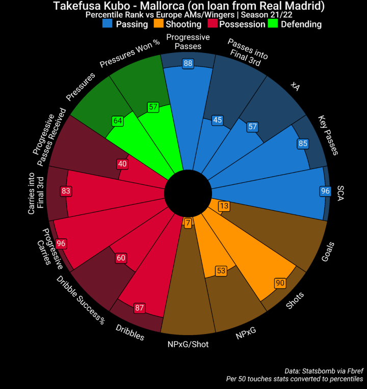优点:久保健英在技术层面没问题。如披萨数据图所示,他的控球、传球、组织和带球都很好。久保健英善于推进球权和创造射门机会,带入威胁区域的能力也是突出优势。得益于带球能力和门前视野,久保健英能获得可观的射门机会。总的来说,他是一位非常像马塔的球员,或者以滕哈格的视角来看,是齐耶赫那种类型。