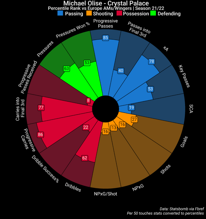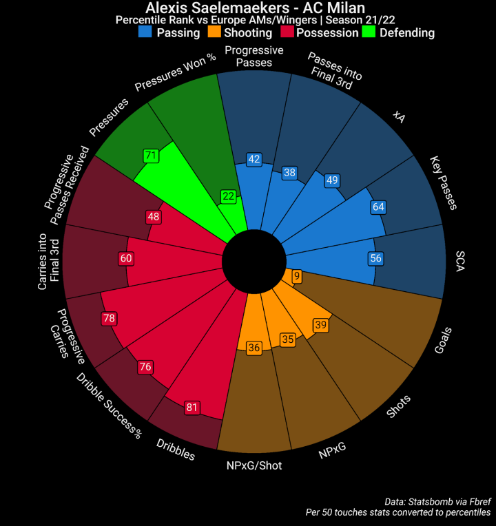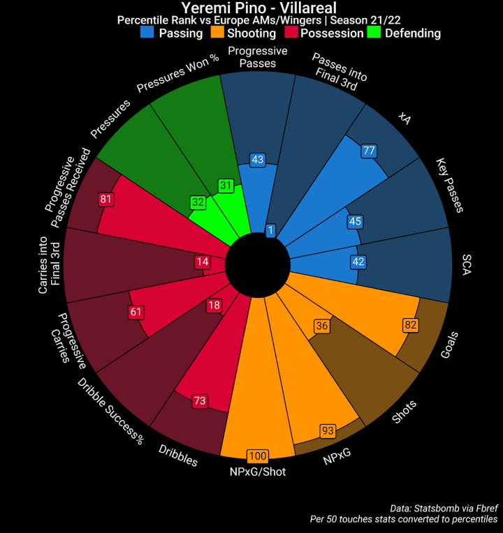 注意:下文披萨数据图中的百分位数是基于本文的筛选数据库得到的,并不是Fbref网站的原本百分位数。由于数据库总样本量更少,本文的百分位数可能看着更为极端一些,也能让我们知道某位球员的特定数据跟其他人相比孰优孰劣。