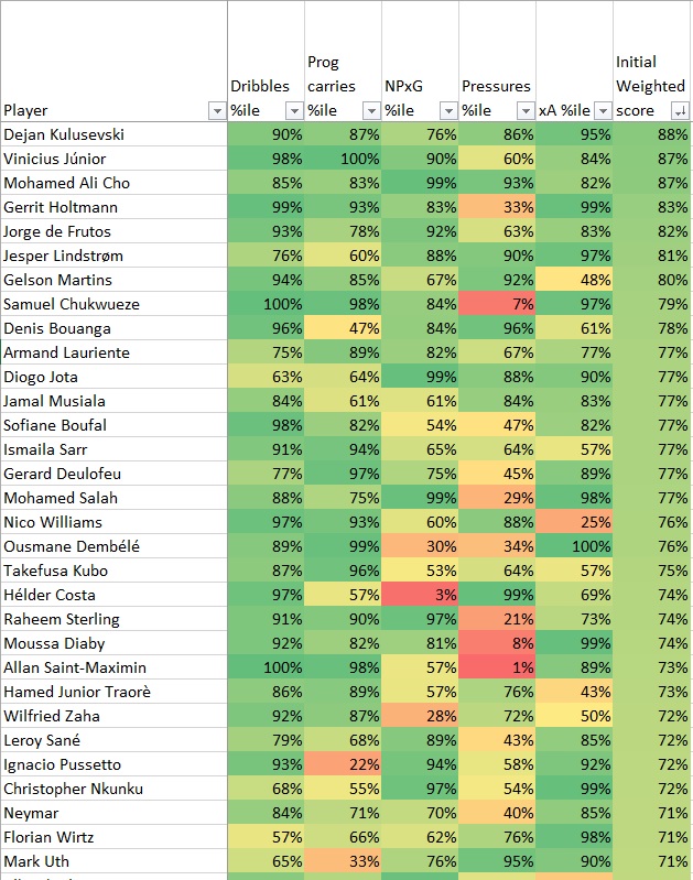 库卢塞夫斯基和维尼修斯是筛选结果的头两位,说明这个思路是可行的。即便只是肉眼观察,库卢塞夫斯基也是一位完美结合了带球、创造力、得分能力和逼抢能力的右边锋,能给任何一支顶级球队带来帮助,就像热刺上赛季体验的那样,而维尼修斯过去这一年间的表现堪称上天的恩赐。