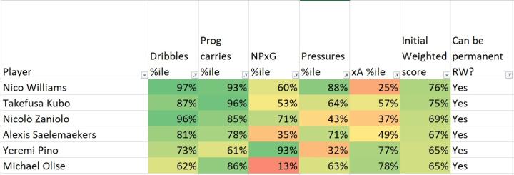 所以,我们的筛选方向没错。下一步就是理清其中哪些右边锋是比较现实的人选。我们需要过滤掉在左路表现更好(比如阿里-乔、霍尔特曼等)和现阶段不会加盟曼联(萨拉赫、库卢塞夫斯基等)的球员。我还给各项数据设定了最低门槛,避免选出的球员有明显短板(比如楚克乌泽这种极其不擅长逼抢的球员)。