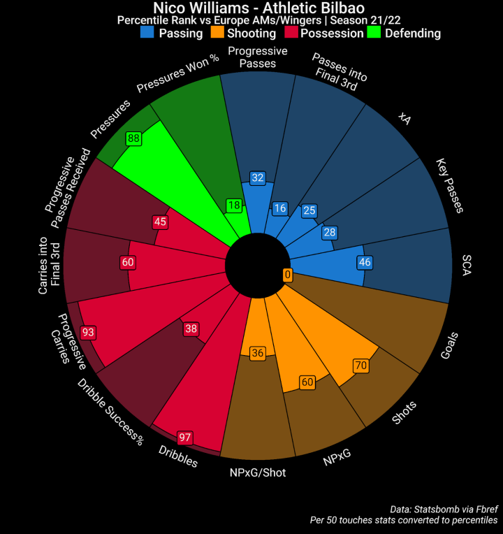 这是毕巴球员伊纳基-威廉姆斯的亲兄弟。尼科入围候选名单是因为他开启职业生涯至今在右边锋位置上出场44次,只在左路踢了6次。如你所见,他的生涯经验并不丰富。他上赛季仅有2次替补出场,本赛季迎来重大突破,各项赛事合计出场40次,其中14次为首发。毕巴本赛季主打4-4-2阵型,贝伦奎尔是右路主力,但尼科给他带来了巨大的竞争压力,经常得到轮换机会。到赛季尾声阶段,尼科已经成了出场次数更多的球员,上赛季最后5轮更是连续首发出场,似乎已经锁定了右路的首发位置。