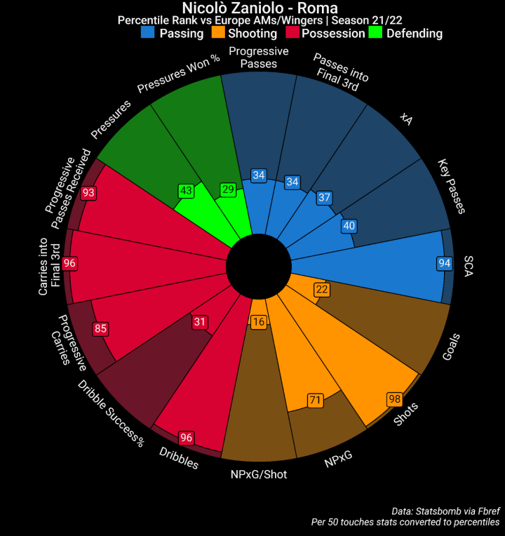 扎尼奥洛在中场位置上开启职业生涯,经常出任B2B中场或攻击型中场。他一共在攻击型中场这个位置上出场了83次,多过右边锋位置上的51次。但随着时间推移,扎尼奥洛的比赛重心逐渐挪到了右路。本赛季他在三前锋阵型的右边锋位置上出场20次,还在双前锋阵型中踢了18次的右侧支援前锋。看上去右边锋就是扎尼奥洛今后的主打位置了,不论是继续留在罗马还是转投其他俱乐部。此前罗马改打五后卫阵型使得扎尼奥洛的出场机会减少,这显然就是他跟穆里尼奥起争执的原因。