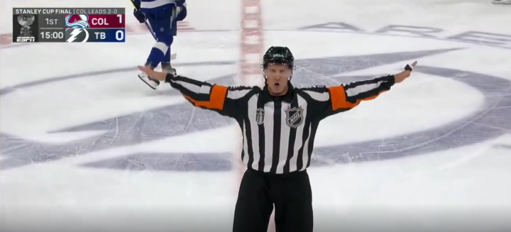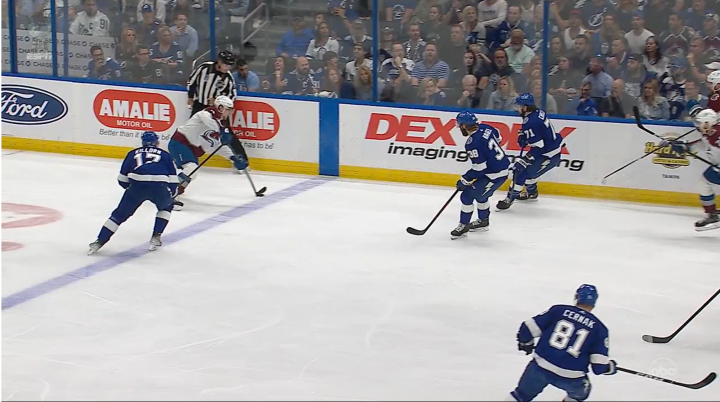 首节开场5分钟,雪崩29号麦金农传球给13号尼楚什金,后者腕射把球打进!雪崩1:0取得领先。但此时闪电教练组提出挑战,认为此球存在越位。经录像回看,在雪崩球员传球的瞬间,已经有雪崩球员先于球的整体进入了蓝线,因此裁判果断宣布"No goal",进球无效!双方的比分回到0:0.