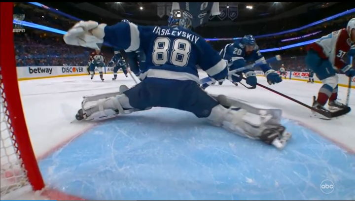 首节还剩16分18秒,闪电门将瓦西列夫斯基一上来就发威了!雪崩8号马卡尔的大力腕射打在闪电77号赫德曼身上产生变线,瓦西用手套把来球挡下,随后又用右护腿板把康弗尔的补射拒之门外!避免了闪电先丢球。