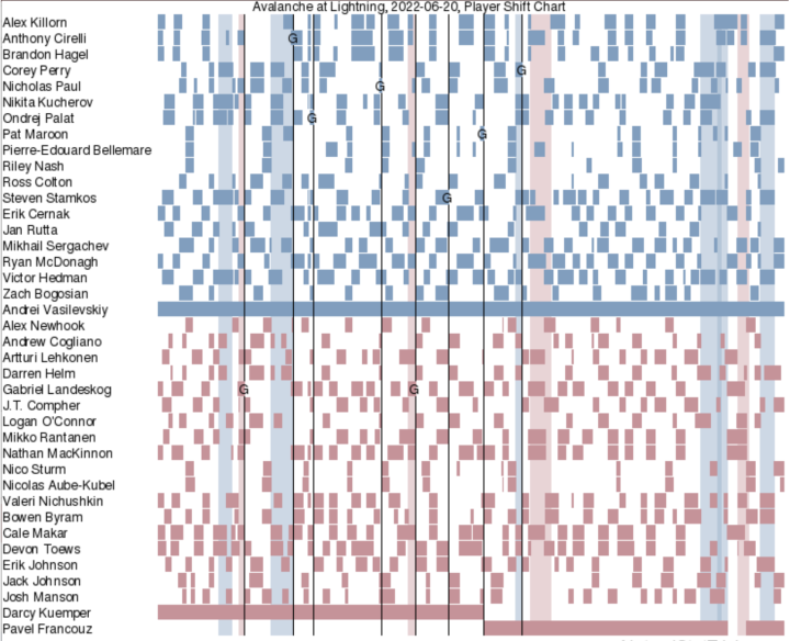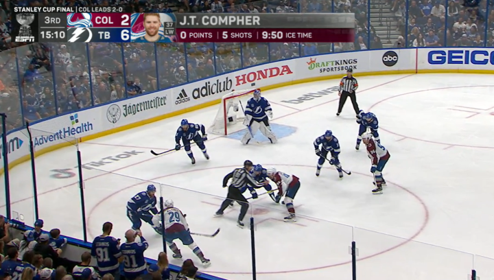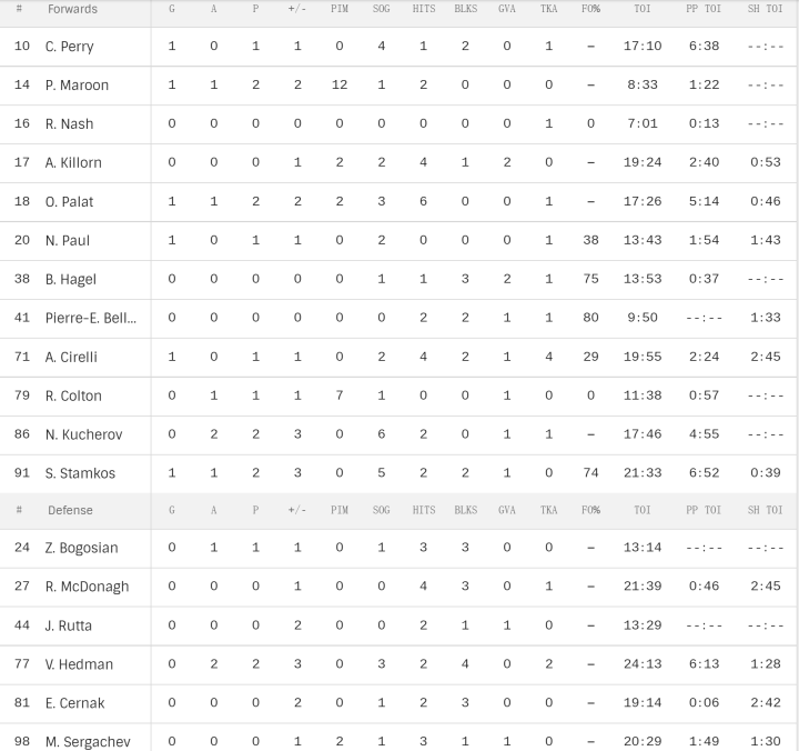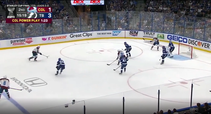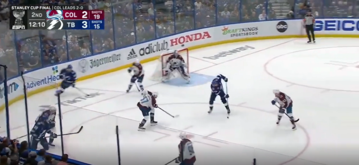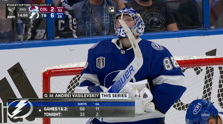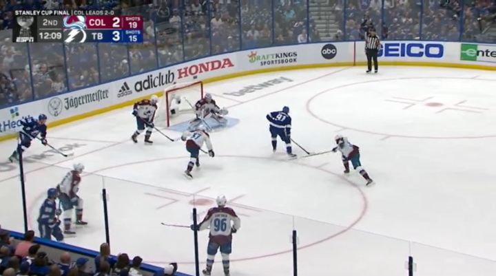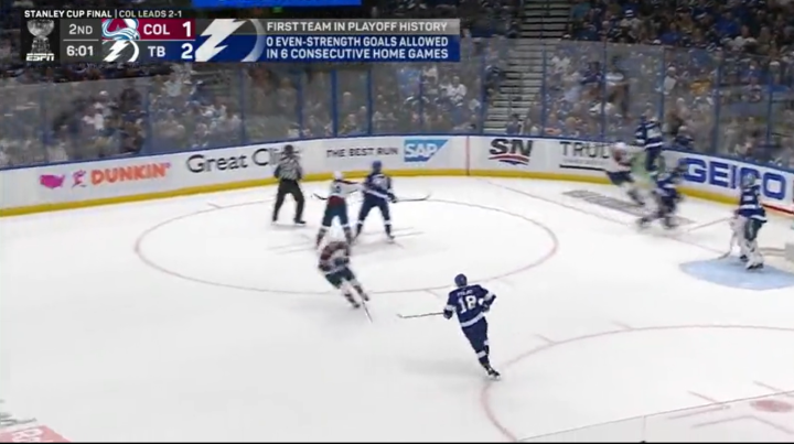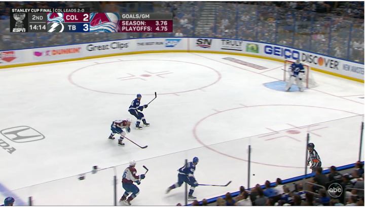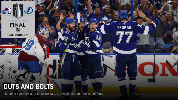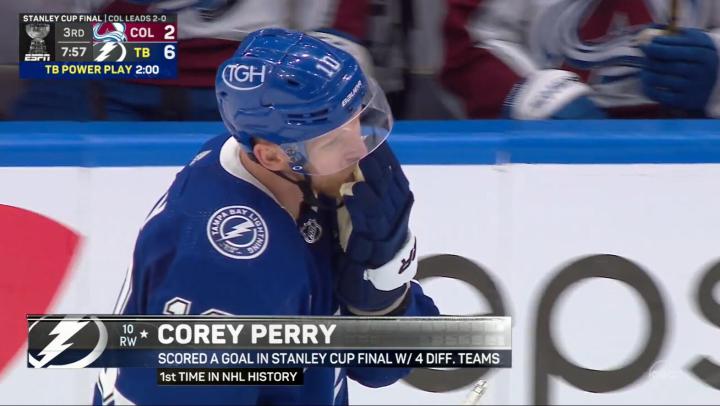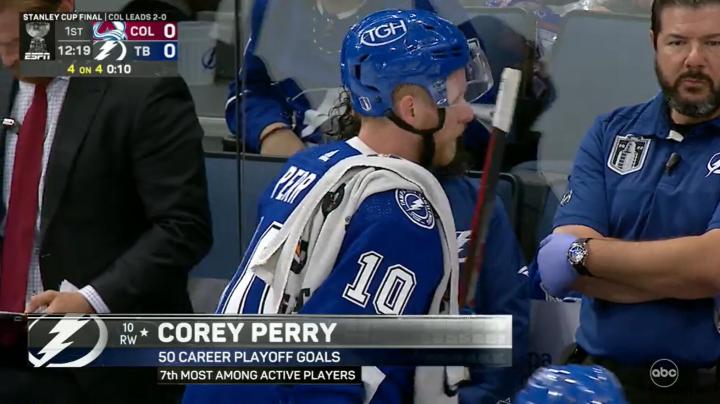 总决赛GAME 3,闪电6:2取得大胜。科里·佩里的多打少进球,是两队总决赛赛场上打进的第22个进球(其中雪崩打进13球)。这是总决赛40年来,双方前三场进球数最多的一个系列赛。1982年总决赛,岛人和加人在总决赛前三场一共打进24球(其中岛人打进15球)。
