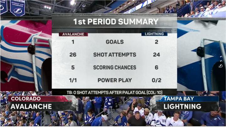 首节结束,闪电2:1领先雪崩。雪崩射门数26次,射正数14次均比闪电多2次,但是比分落后。