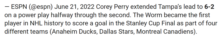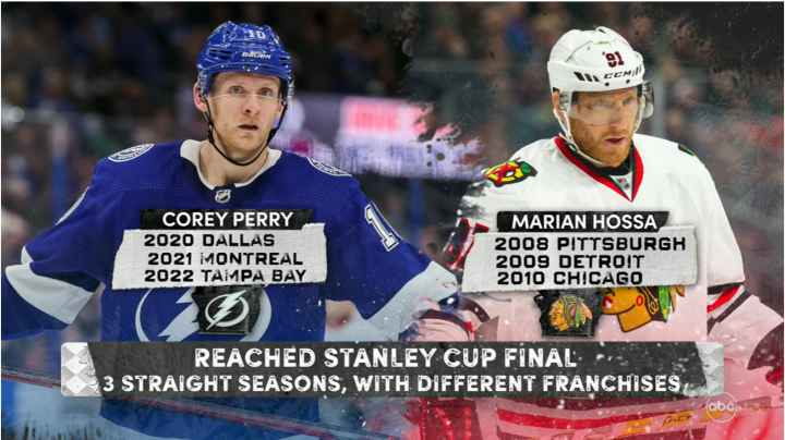 科里·佩里代表四支不同的球队(闪电、加拿大人、星、小鸭)在总决赛中都取得进球,成为历史第一人.除了他,没人能够代表四支不同球队在总决赛中都有进球。
