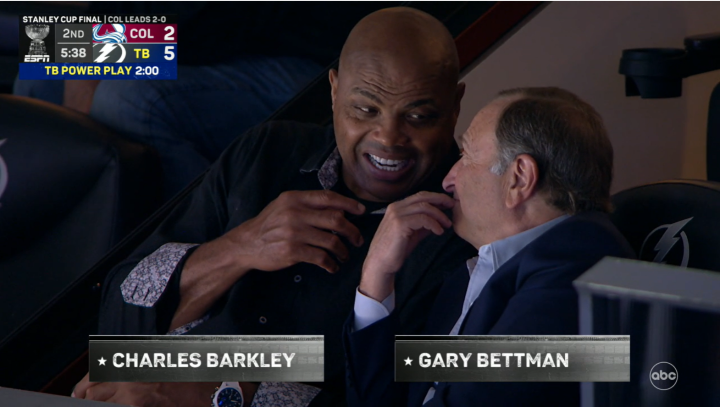 在多打少开始前,场边摄像机拍到著名评论员、前NBA巨星巴克利和NHL总裁贝特曼先生坐在一起,密切交谈。
