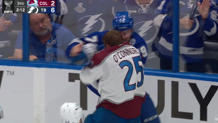 末节还剩2分12秒,闪电的科尔顿和雪崩的25号洛根·奥康纳直接开始在场上单挑打架。