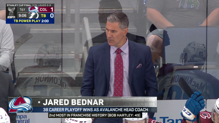 贝德纳尔作为雪崩主帅,带队拿了38场季后赛的胜利。在历任雪崩主帅中,贝德纳尔的季后赛胜场数排在队史第二位,仅次于拿了49胜的鲍勃·哈特利。