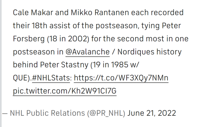 马卡尔和兰塔宁本赛季季后赛已经送出18次助攻,追平了彼得·福斯贝里在2002年的季后赛助攻数。这是球队更名为雪崩后,队史单赛季季后赛助攻次数的最高纪录如果算上之前队名为"魁北克北欧人"的历史,只有1985年的彼得·斯塔斯特尼的季后赛助攻数(19次)比上述三个人更高。