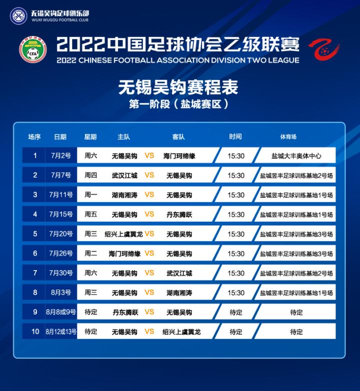 收藏!无锡吴钩2022赛季中乙联赛第一阶段赛程出炉! 无锡吴钩足球俱乐部 无锡吴钩足球俱乐部2022-06-27 22:30新赛季、新征程!今天,2022中国足球协会乙级联赛第一阶段赛程正式对外公布,第一阶段将从7月2日至8月13日,在黔南、盐城、大连三个赛区展开。7月2日下午15:30,新赛季中乙联赛开幕式及揭幕战,无锡吴钩VS海门珂缔缘,让我们一起拭目以待!江苏德比,携手共创新未来!展开更多