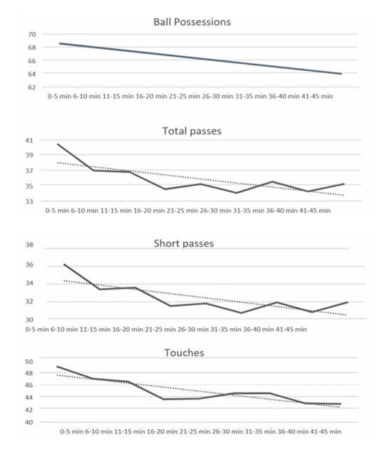 主队的表现通过7个变量来衡量(控球率、界外球、短传、长传、传球成功率、触球和防守方面(解围+犯规+抢断),时间为5分钟(0-5、6-10、11-15、16-20、21-25、26-30、31-35、36-40、41-45)。0-5分钟的控球率(p<0.01)、传球成功率(p<0.05)、短传成功率(p<0.05)和触球率(p<0.01)均高于其他时间段。然而,随着比赛的进行,主队的表现越来越差。这一趋势从16-20分钟开始急剧上升。这种短暂的效应会根据对手球队的实力而减少或增加(p<0.01):对手越优秀,这种效应在比赛开始时就越明显。< p="">