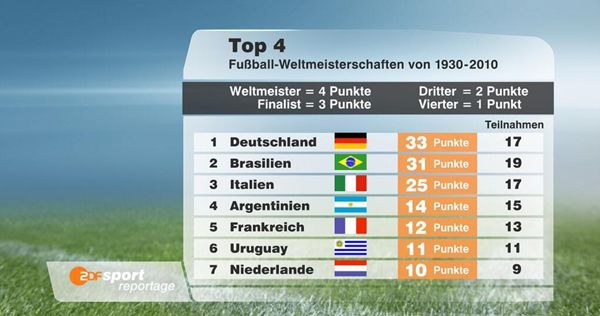 随着德国队成为第一支连续四届闯入世界杯四强的球队,人们不禁要感叹这支球队的稳定。不管你是不是德国队的忠实球迷,还是你无论如何都无法喜欢上德国足球,德国队是世界杯历史上综合成绩最好的球队,这是任何人都无法否定的事实。德国的一家媒体按照以下规则,做了一个世界杯总成绩的排行:1930年到2010年,所有打入世界杯四强的球队如果排一个名次。冠军4分,亚军3分,季军2分,第四名1分,最终的排行榜是这样的: