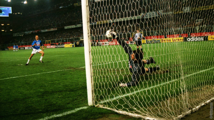 1995年带着卫冕之心的希曼在欧洲优胜者杯半决赛中,面对风头真劲的桑普多利亚他又扑出了三粒点球