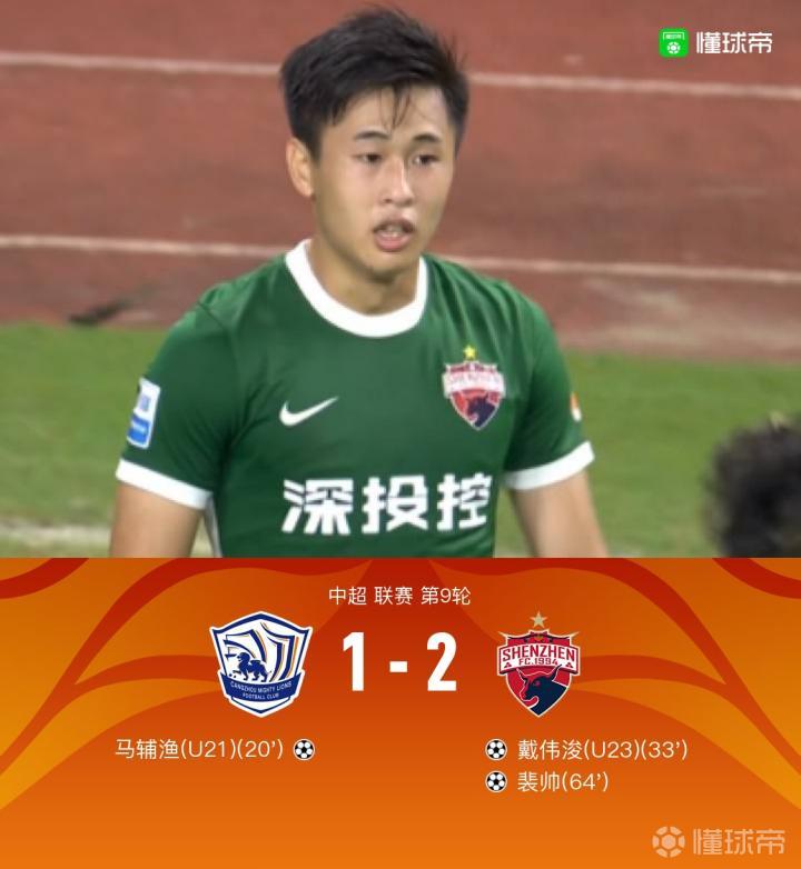 第65分钟,戴伟浚开出角球,禁区内裴帅左脚抽射破门,沧州1-2深圳。