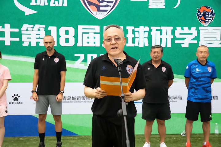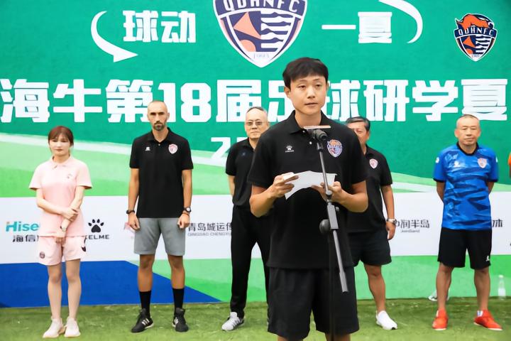 7月16日下午,2022青岛海牛“球动一夏”第18届足球研学夏令营在虎山基地梦想球场热闹开营。开营仪式上,俱乐部副总经理国玉中介绍了本届夏令营的情况,教练员代表王纪昊、小营员代表薛淼龙先后发言。著名青训专家、老海牛名宿刘乐阳宣布夏令营开营。海牛女足领队刘文一,梯队队员代表王韬、黄英豪、唐瑞锴、刘千硕等也在开营仪式上亮相。