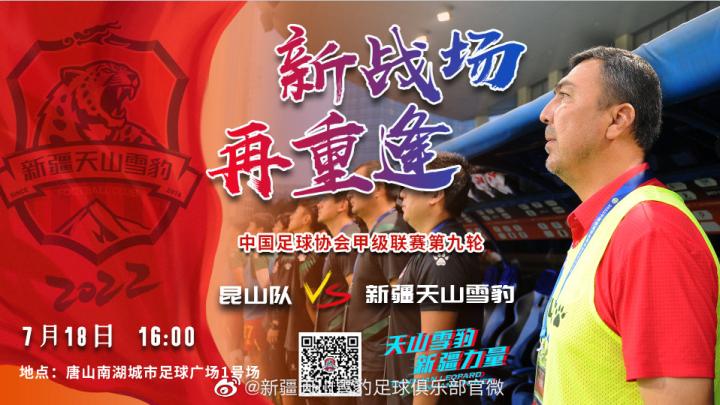比赛预告:新战场 再重逢#2022赛季中甲联赛 ...新疆天山雪豹足球俱乐部 @懂球帝2022-07-18 11:11比赛预告:新战场 再重逢 #2022赛季中甲联赛 # #第二阶段第九轮# 新疆天山雪豹客场对阵昆山队 [加油][加油][加油] 比赛时间:7月18日 周一 16:00 直播平台:“新疆天山雪豹足球”视频号、“赛事抢鲜看”微信小程序、胜利者体育微信公众号,以下图片为各平台直播二维码。展开更多