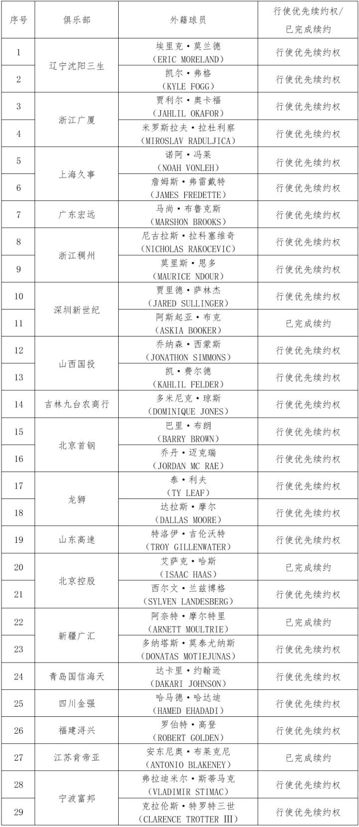 北京时间7月19日,CBA官方公布了关于2022-2023赛季CBA各俱乐部行使外籍球员优先续约权,其中辽宁队莫兰德、弗格行使优先续约权,北京控股的哈斯已完成续约,之前效力于首钢的林书豪和广东队的威姆斯、莱多均不在名单中。