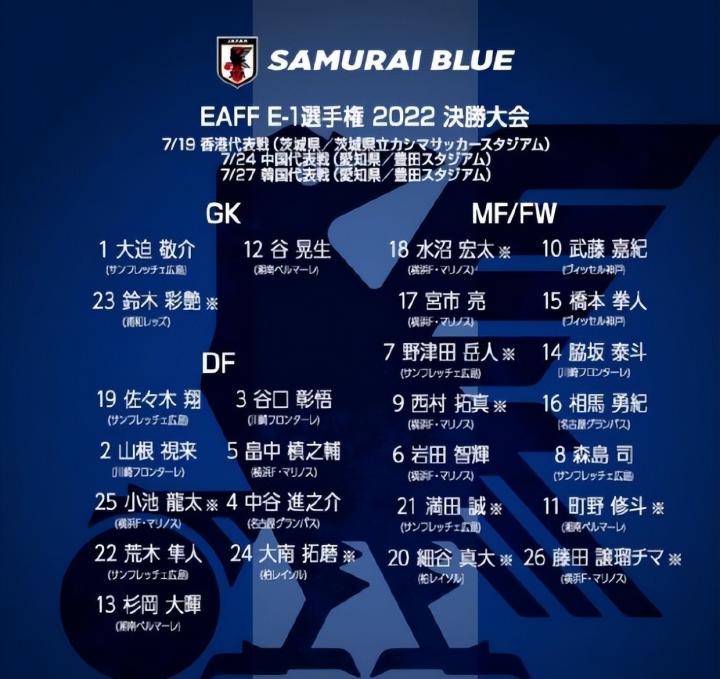本届东亚杯,日本队派出了全部本土联赛球员出战。其中,J联赛中生代球员为本届日本征战东亚杯的骨架,辅以8名U23球员。