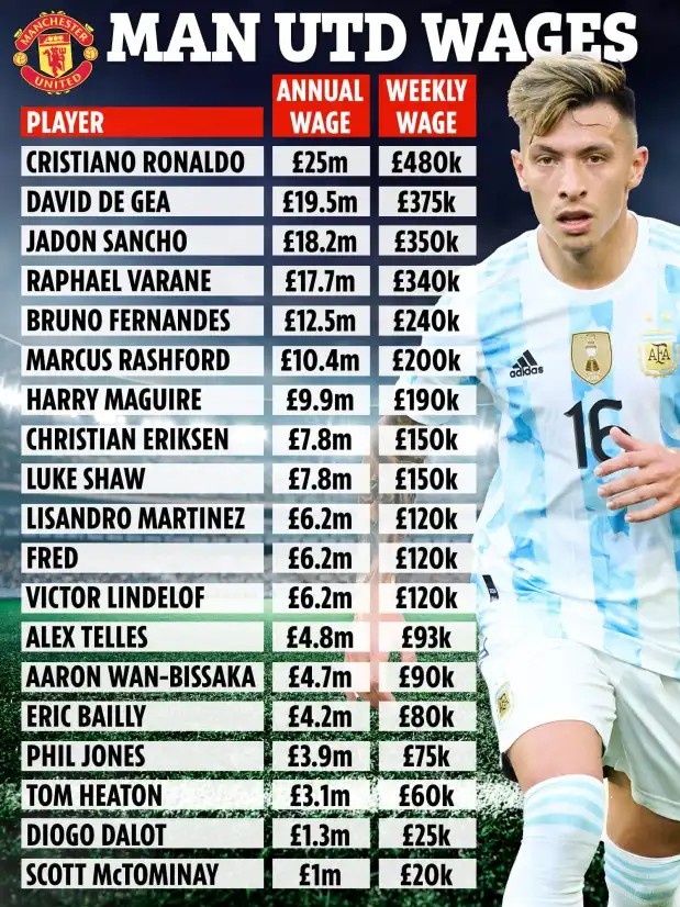 曼联球员工资名单 1.C罗 年薪:2500万镑 周薪:48万镑 2.德赫亚 年薪:1950万镑 周薪:37.5万镑 3.桑乔 年薪:1820万镑 周薪:35万镑 4.瓦拉内 年薪:1770万镑 周薪:34万镑 5.B费 年薪:1250万镑 周薪:24万镑 6.拉什福德 年薪:1040万镑 周薪:20万镑 7.马奎尔 年薪:990万镑 周薪:19万镑 8.埃里克森 年薪:780万镑 周薪:15万镑 9.卢克-肖 年薪:780万镑 周薪:15万镑 10.利桑德罗 年薪:620万镑 周薪:12万镑 11.弗雷德 年薪:620万镑 周薪:12万镑 12.林德洛夫 年薪:620万镑 周薪:12万镑 13.特莱斯 年薪:480万镑 周薪:9.3万镑 14.万-比萨卡 年薪:470万镑 周薪:9万镑 15.拜利 年薪:420万镑 周薪:8万镑 16.菲尔-琼斯 年薪:390万镑 周薪:7.5万镑 17.希顿 年薪:310万镑 周薪:6万镑 18.达洛特 年薪:130万镑 周薪:2.5万镑 19.麦克托米奈 年薪:100万镑 周薪:2万镑 看看麦克托米奈和达洛特的周薪吧 以后别骂人家了,人家就没拿主力球员的薪水,却干的主力球员的活。 他俩的薪水还不如替补门将希顿呢,甚至都不如常年缺战的琼斯。 这小麦克的薪水是咋谈的,有没有经纪人?
