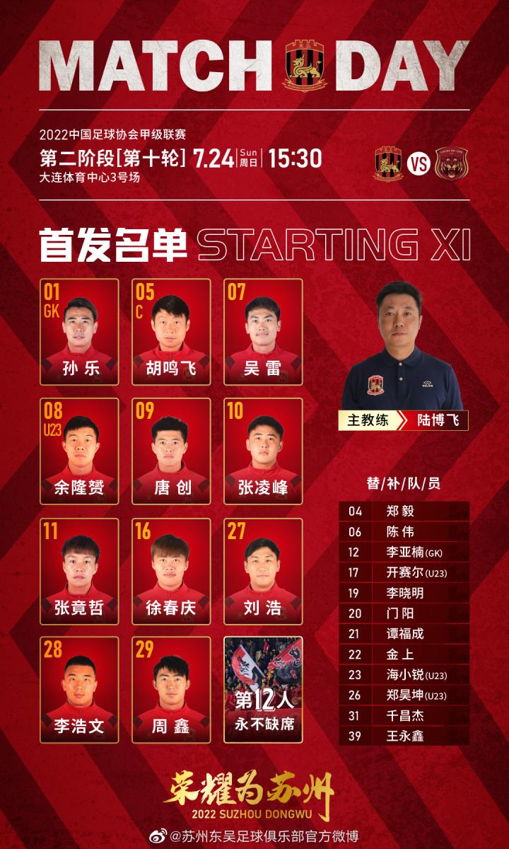 2022中国足球协会甲级联赛第十轮,苏州东吴VS上海嘉定汇龙,今日首发名单。