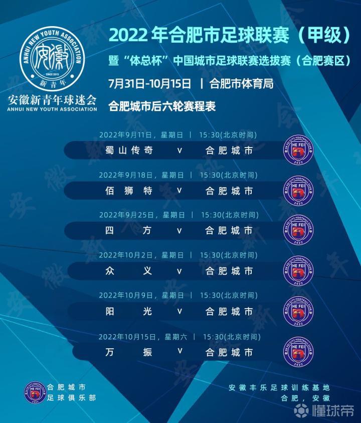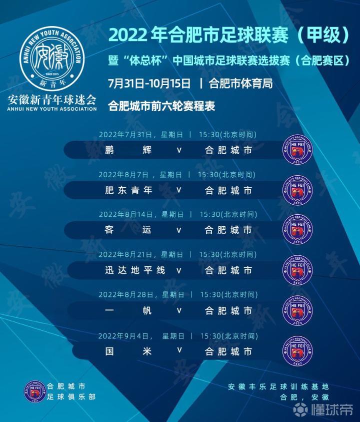 首届‘体总杯’来了!合肥城市参战!允许外援+冠名、已超二百地级市报名!附赛程表         为了更好的选拔出合肥市代表队参加全国首届‘体总杯’城市联赛,市体育局将于7月底-10月举办2022合肥市足球甲级联赛暨‘体总杯’中国城市联赛合肥选拔赛,届时将以优胜球队为班底,组建“合肥代表队”参加全国赛。作为全省目前唯一志在职业联赛的合肥城市足球俱乐部亦报名了本次选拔赛,其赛程如下:      我们希望所有球队踢出水平,选拔出优秀球员,从而组建一支有竞争力的球队代表我们的城市逐鹿全国赛场,展现城市精神!打出安徽风采!      安徽新青年球迷会:安徽领先的非盈利性球迷组织,所有付出,皆源热爱!   关注安徽新青年微信公众号,回复:进群      加入合肥城市官方球迷群,了解更多球队动向!与全省球迷并肩战斗!